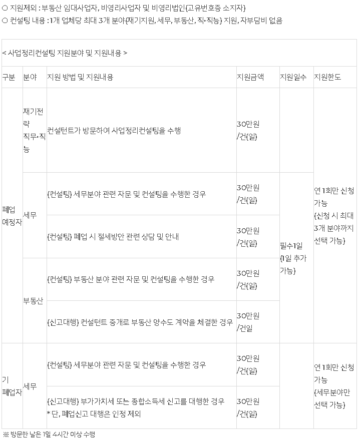 우선 사업정리 컨설팅 같은경우 취업 또는 재창업의사가 있는 폐업예정 또는 기폐업소상공인으로 신청일 기준 사업운영기간이 60일 이상인 경우에 신청이 가능합니다.