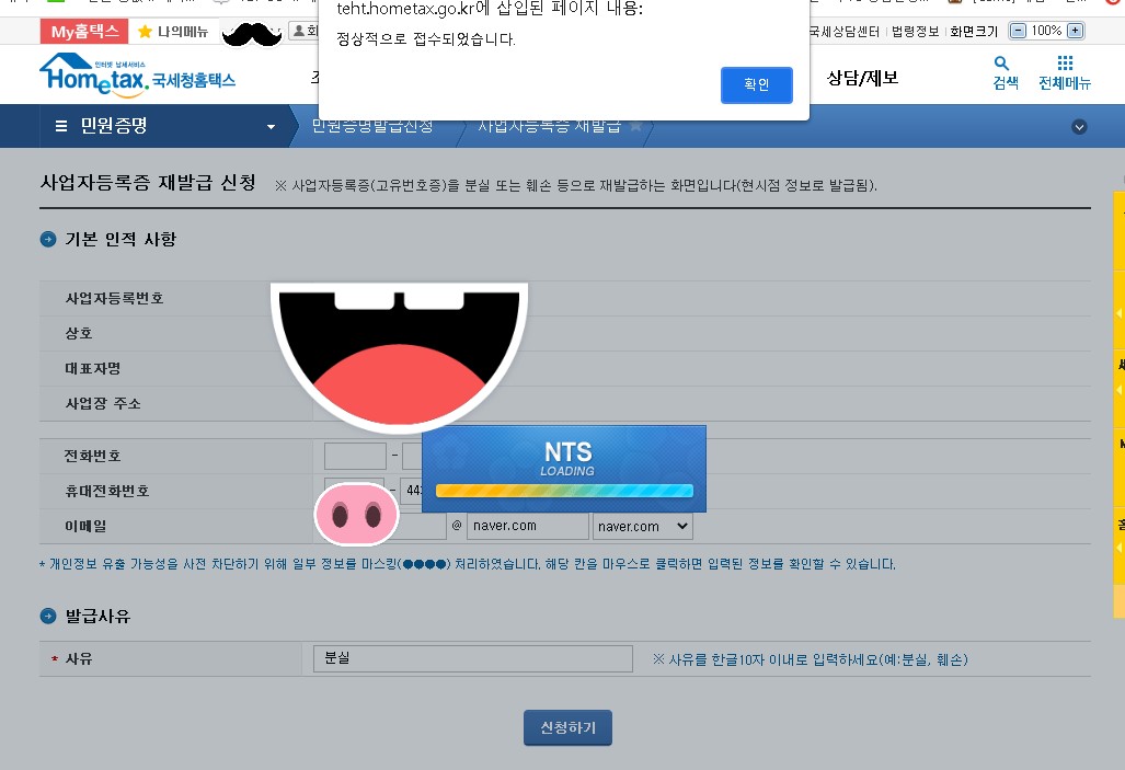 다음과 같이 잠시 로딩후에 '정상적으로 접수되었습니다' 라는 문구 가 뜹니다.