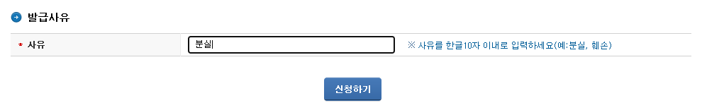 맨 하단의 발급사유에는 '분실' 이라고 적어주시면 됩니다.