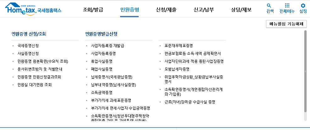 그다음 위의 메뉴중 '민원증명' 에 마우스를 갖다 대면, 이렇게 촤락 펼쳐지는데요,