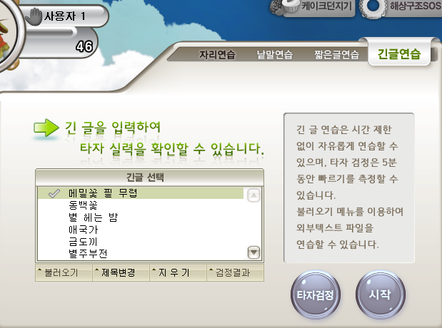 아래와 같이 무설치 프로그램이 시작되면 여기에서 원하시는 항목을 골라 타자연습을 진행하시면 됩니다.