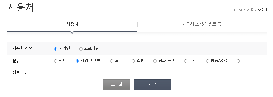 여기에서 '사용처'를 클릭하여 메뉴를 이동해 줍니다.